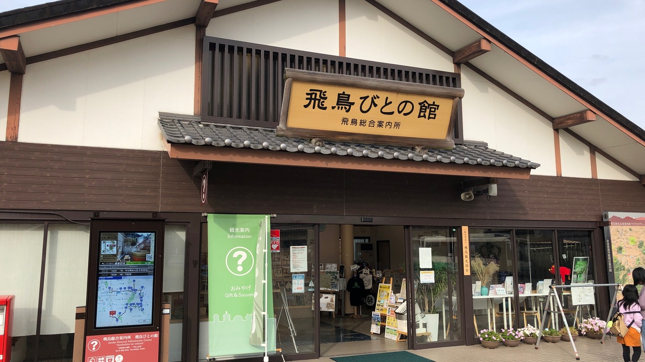 飛鳥駅前にある観光案内所です。三角屋根の和風の建物です。館内はきれいで、土産品コーナーが充実しています。無料で観光パンフレットがもらえる他、周遊バスの一日乗車券の販売、レンタサイクルの受付などもしています。