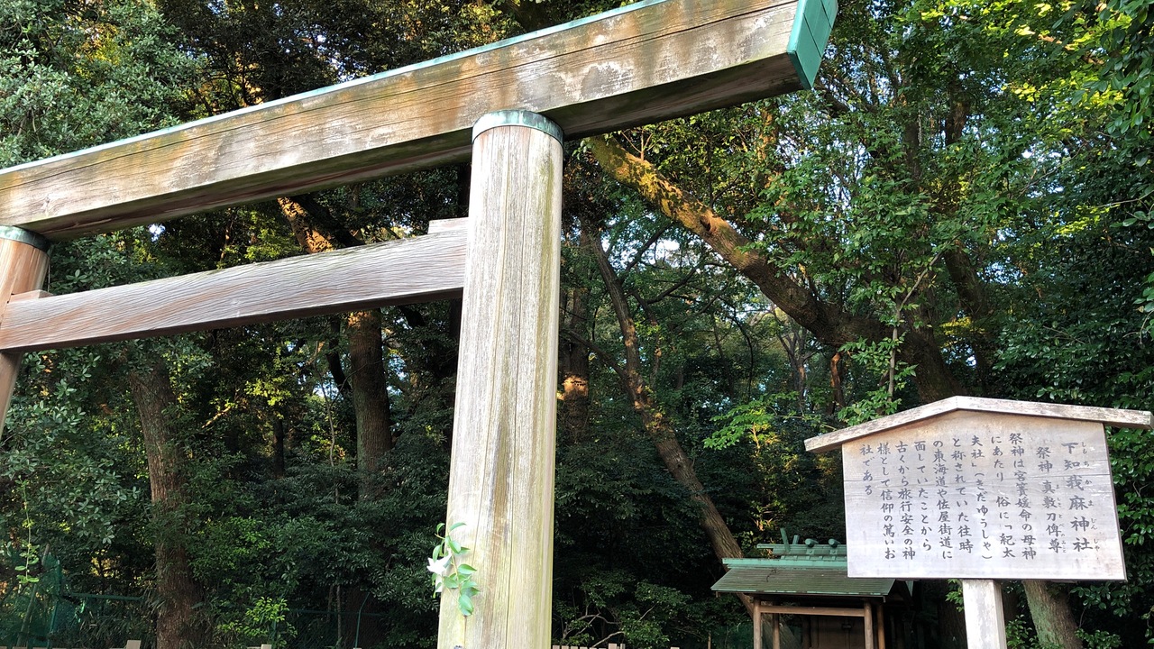 広い熱田神宮の中にある小さな神社です。「しもちかま」神社と読みます。祭神は、真敷刀俾尊(ましきとべのみこと)です。昔の東海道や佐屋街道に面していたことから、旅行安全の神様として信仰を集めてきました。