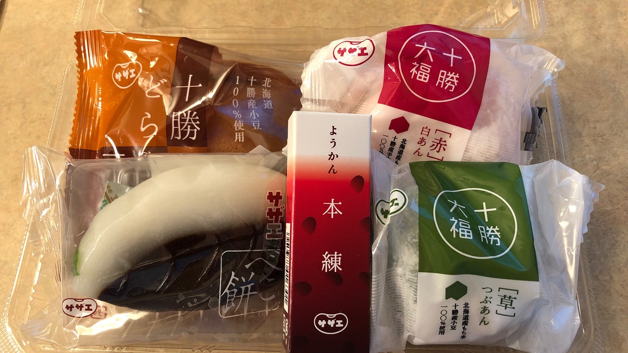 おはぎや団子、たい焼きなどの和菓子のほか、寿司やおにぎりも扱っています。道内各地のスーパー、ショッピングモールなどに支店があります。今回は、大福やようかん、どら焼きなどがパック詰めされたセットを買いました。べこ餅という、中身が入っていない甘い餅が珍しかったです。