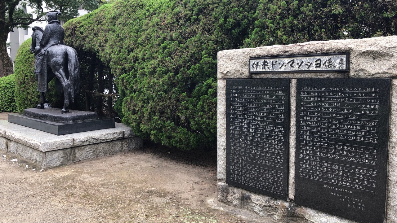 彫刻作品や像が並ぶ遊歩公園にあります。伊東ドンマンショは、ローマ教皇のもとへ派遣された少年使節団の一人です。大友宗麟らにより派遣されました。この像は、ローマ教皇へ会うために、馬で宮殿へ入るシーンだそうです。