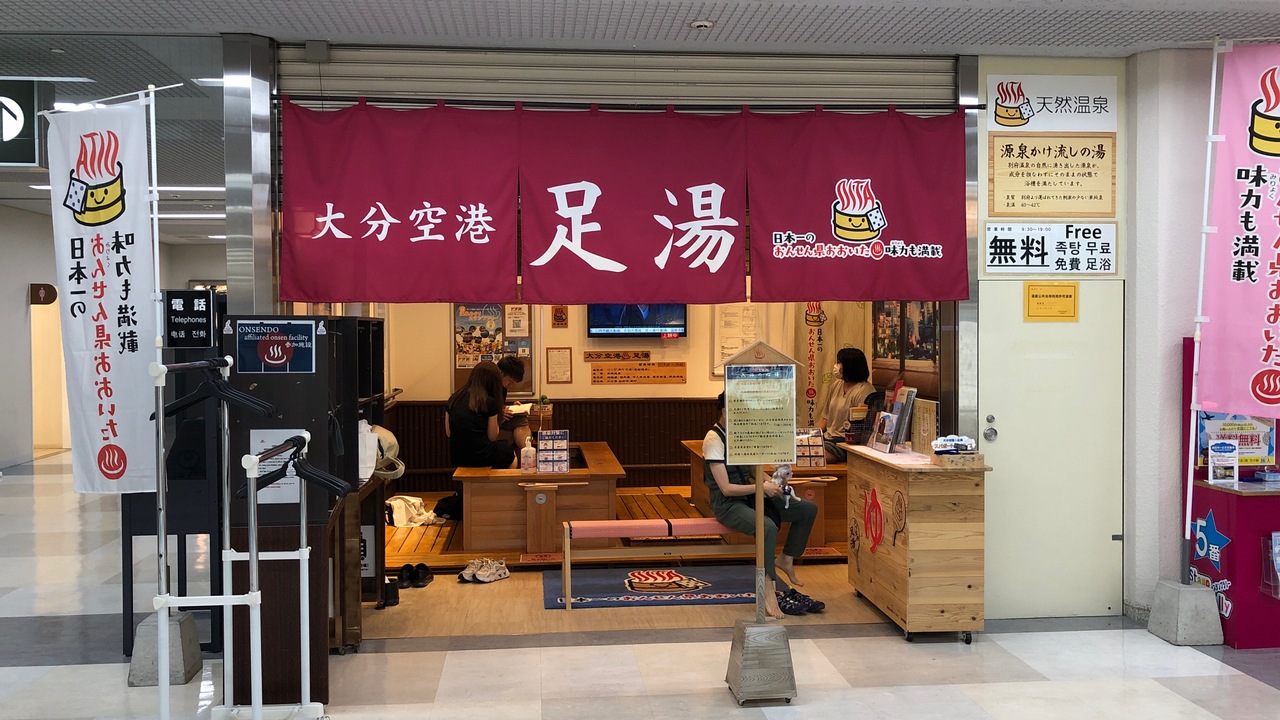 国東半島の海沿いにある空港です。別府までバスで約50分、大分市内まではバスで1時間以上かかります。1Fに無料の足湯があります。別府温泉から運んできて湯です。空港内に足湯があるのは、温泉県である大分ならではです。