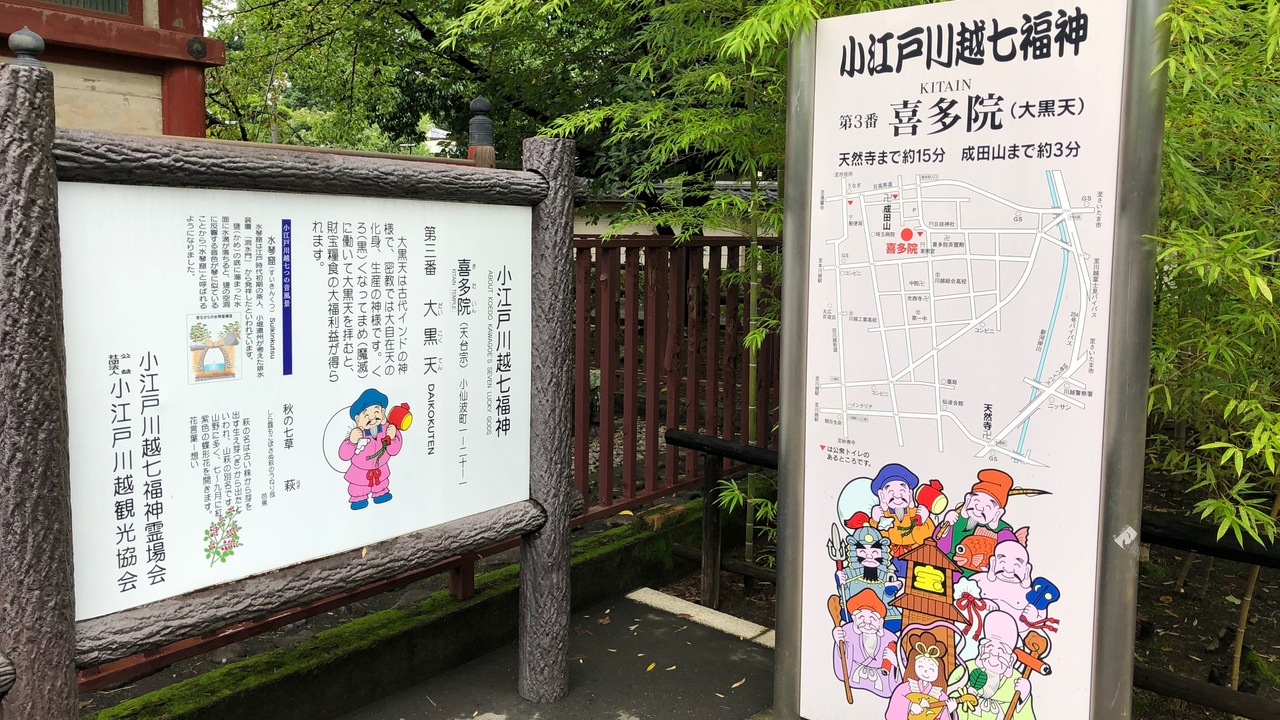 川越市街地の七福神めぐりコースです。埼玉県では、川越や与野の七福神が有名です。妙善寺・毘沙門天、天然寺・寿老人、川越大師 喜多院・大黒天、成田山川越別院・恵比寿天、蓮馨寺・福禄寿神、見立寺・布袋尊、妙昌寺・弁財天があります。