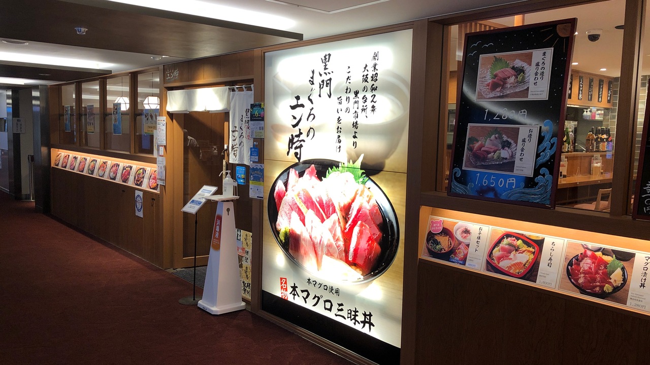 伊丹空港のレストランフロアにあるまぐろ専門店です。黒門市場から直送とかかれており、安心感があります。まぐろ漬け丼1280円を食べました。特製ダレが薄めの味なので、まぐろの赤身の味が堪能できました。KIXカードを見せると割引してもらえます。