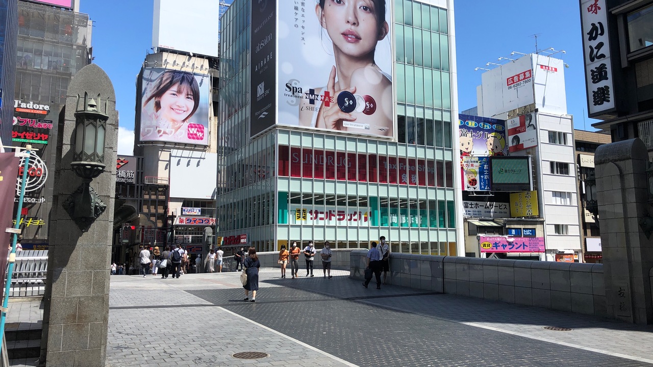 道頓堀川に架かる短い橋です。橋の北側には心斎橋筋商店街、南側には戎橋筋商店街があり、大阪有数の繁華街です。ナンパされやすい橋という意味で「ひっかけ橋」と呼ばれることもあります。なお、「戎橋」という名前は、今宮戎神社へ向かう橋であることにちなんでいます。