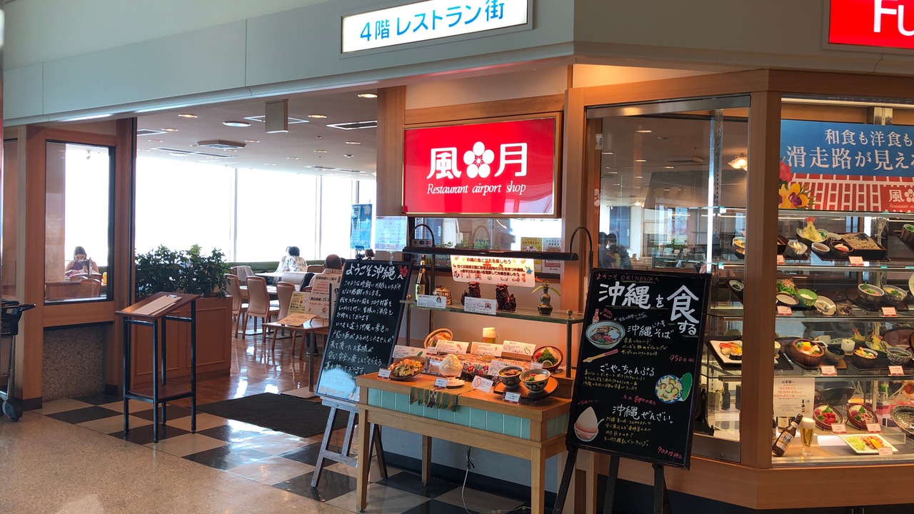 那覇空港国内線ターミナル4Fのレストランフロアにあります。和食・沖縄料理が中心です。広い店内は滑走路も見ることができ、ゆっくりできます。値段は高めで、沖縄ぜんざいが700円、沖縄そばが900円と、街中の2倍ぐらいの値段でした。