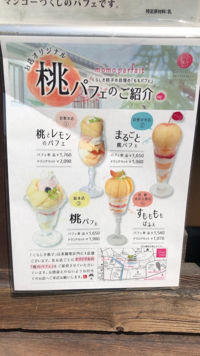 くらしき桃子は、美観地区に4店舗ある、フルーツショップです。店名のとおり、桃パフェがおすすめですが、4店舗の桃パフェは、それぞれ違います。総本店の桃パフェは、単品だと1650円ですが、340円プラスすればドリンクセットになります。このドリンク、フレッシュフルーツジュースなども選べるのでお得です。