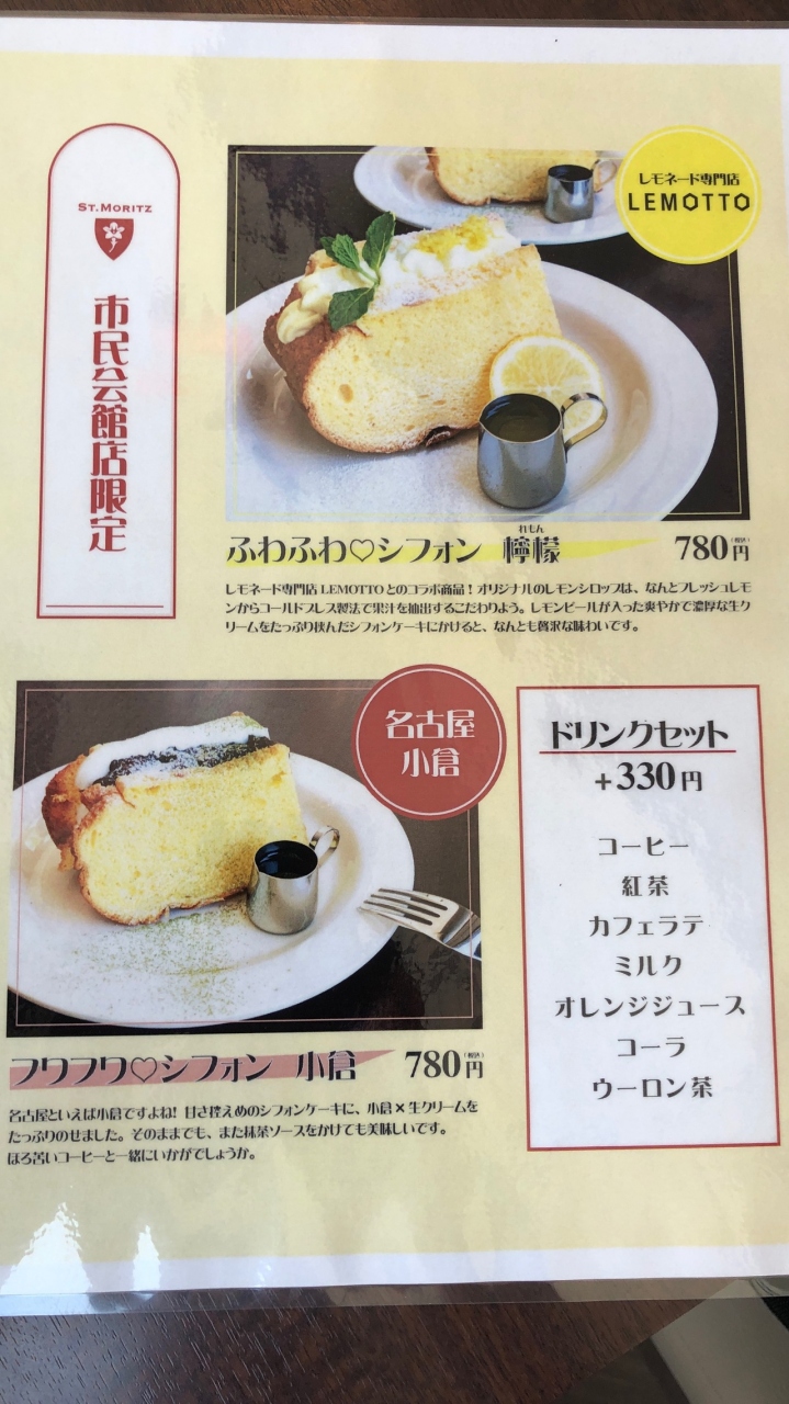 金山の名古屋市民会館(日本特殊陶業市民会館)の中にあるカフェ・レストランです。サンモリッツは、バナナが入ったシュークリームが名物ですが、こちら市民会館店でもいただけます。市民会館店限定のシフォンケーキもありました。ただ、シフォンケーキ単品で780円、プラス330円でドリンク付きと、少し高めに感じました。店内は広く、ゆったりできます。