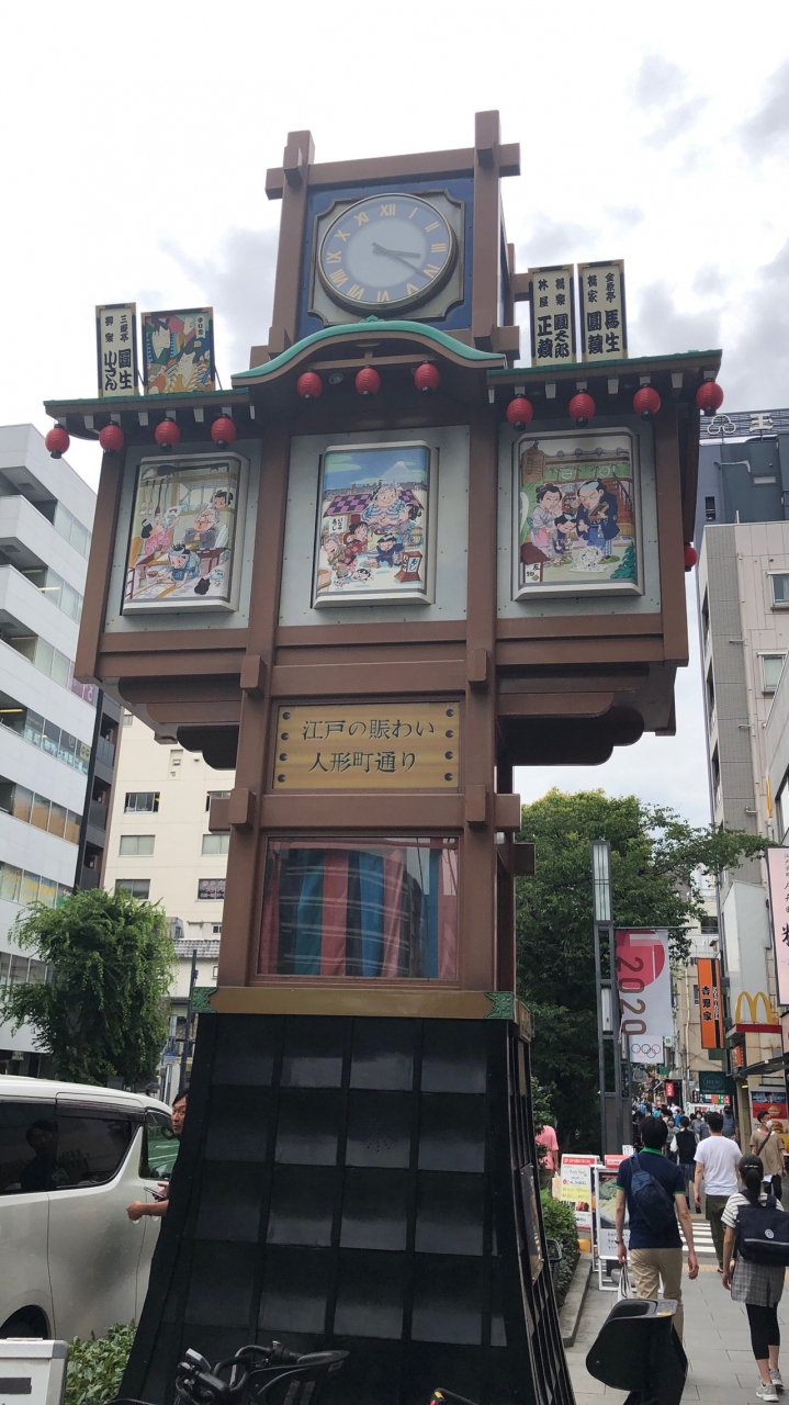 人形町通りにあるからくり時計です。建物の2階ぐらいの高い時計なので、目立ちます。11時から19時の毎時0分に動き始めます。約2分間です。下の部分の緞帳が開き、上の部分の絵が回転して、江戸落語「人形町の由来」が流れます。