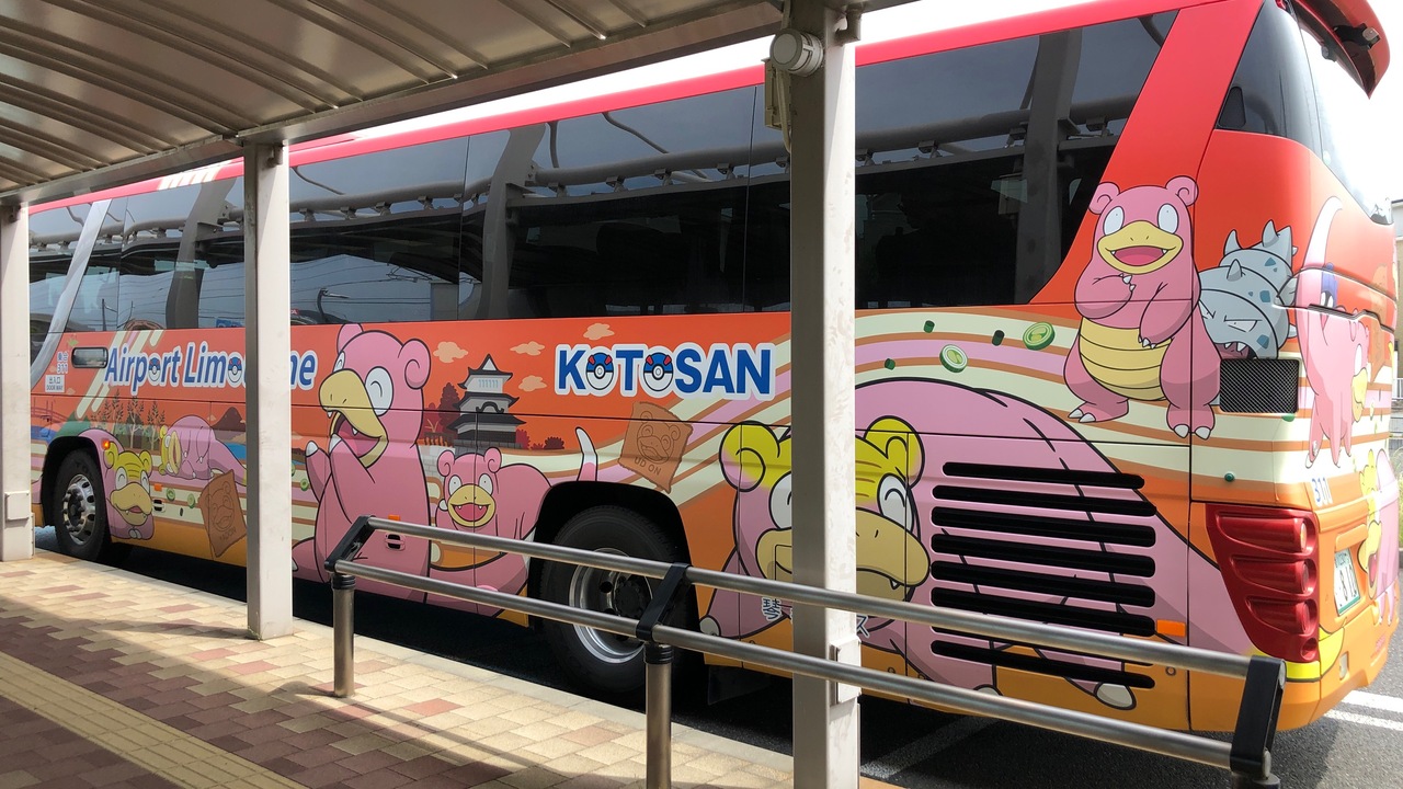 高松空港は、近くに鉄道の駅がありません。ことでん空港通り駅がありますが、高松空港からは離れています。そのため、高松市内、坂出・丸亀方面へ、バスが走っています。写真のような、ご当地ポケモン・ヤドンのラッピングバスもあります。