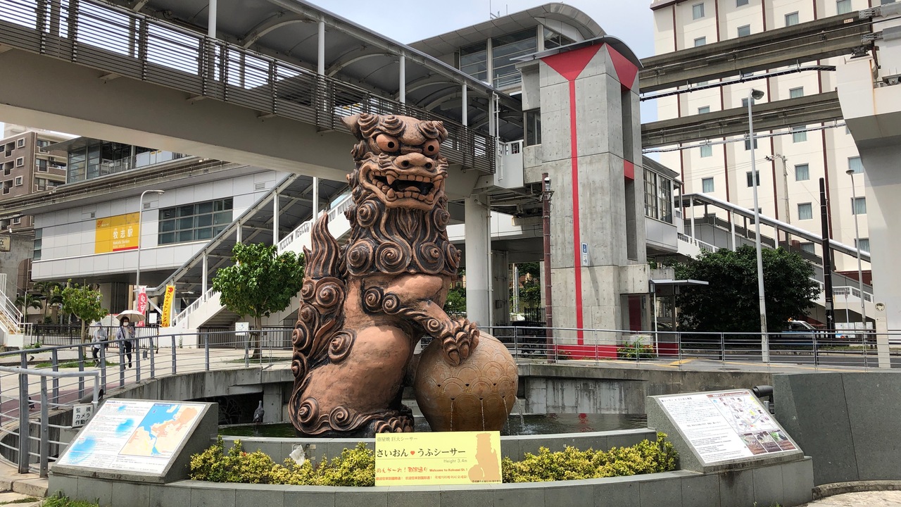 ゆいレール牧志駅近くにある大きなシーサーです。国際通り沿いにあり、高さ3.4mです。沖縄の伝統工芸・壺屋焼で作られています。「さいおん」は、この近くにかかる橋の名前、「うふ」は沖縄の言葉で「大きい」という意味です。