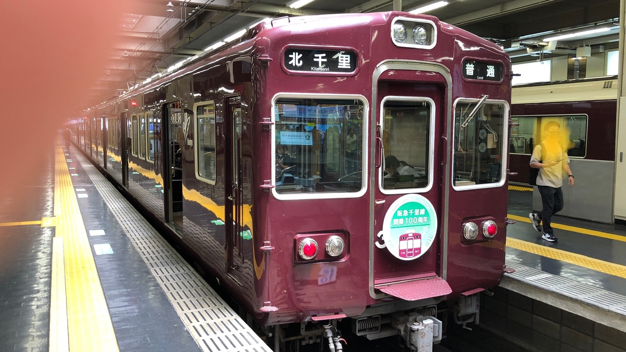 天神橋筋六丁目~淡路~関大前~北千里を結びます。天六から大阪メトロ堺筋線に直通、淡路から阪急京都線に直通する電車もあります。2021年、開業100周年を迎え、電車の正面にヘッドマークがつけられていました。