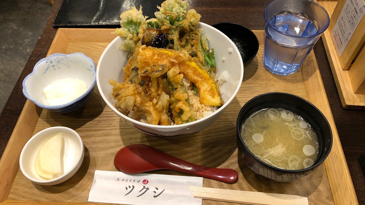 志木駅の商業施設・エキア2Fにあるそば屋・天ぷら屋です。チェーン店っぽくないので、気になり入店しました。野菜天丼800円を食べました。天ぷらは揚げたてでおいしかったです。ご飯に芯が残っている部分があり、その点は残念でした。駅近くのホテル「東横イン」に泊まった際、ツクシの1品サービス券をもらったので、山芋とろろをサービスしていただきました。