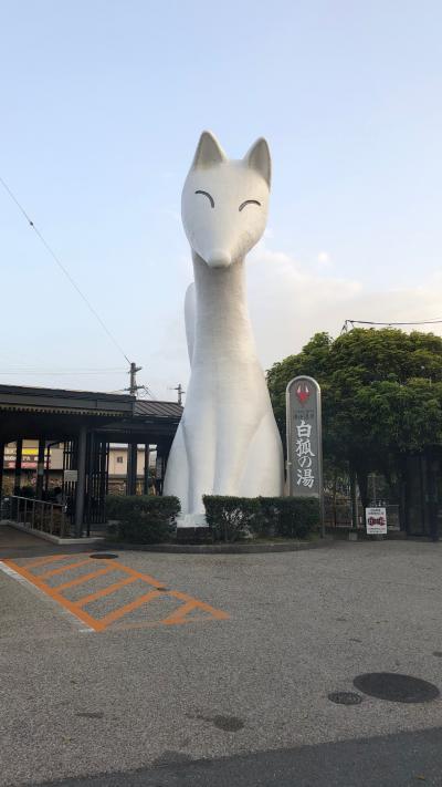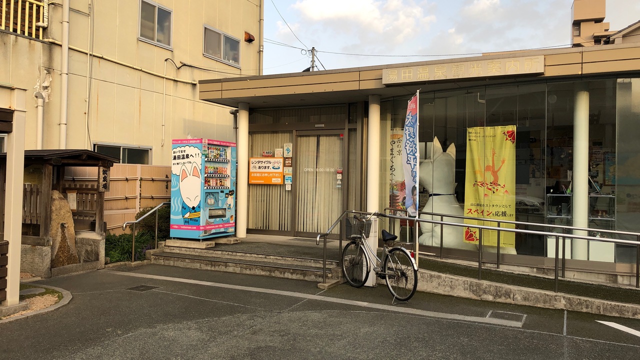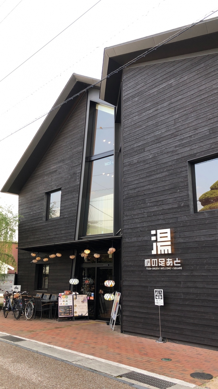 湯田温泉の複合観光施設です。黒い外観が印象的です。カフェや観光パンフレットコーナー、足湯があります。カフェでは、外郎ミニパフェ、キツネ型の油揚げにアイスを挟んだ「白狐アイス」など、山口らしい物が味わえます。足湯は有料で200円です。