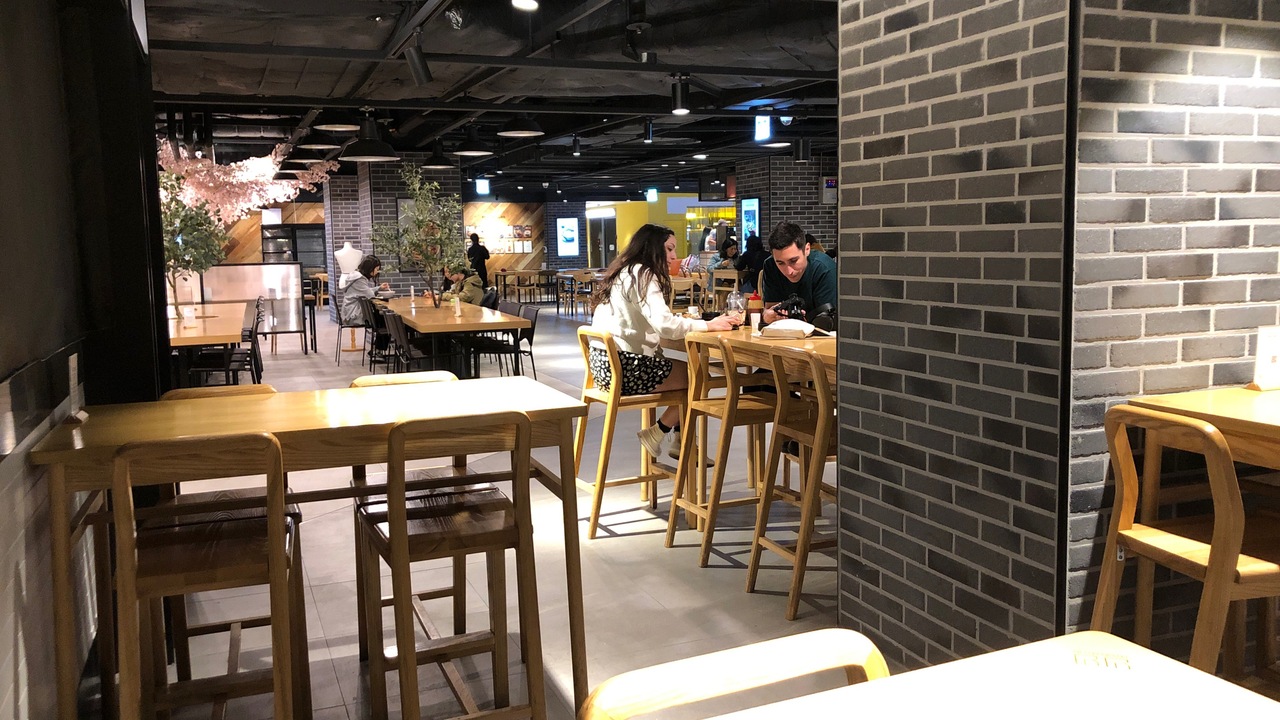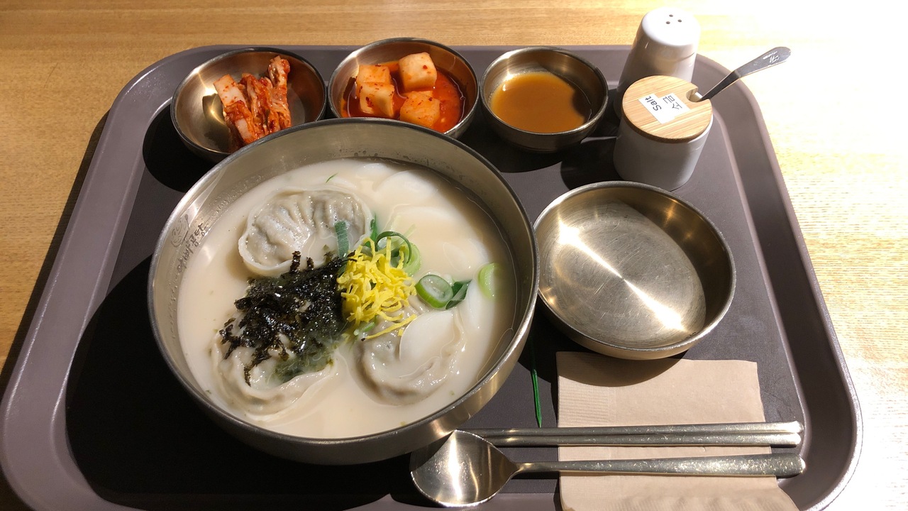 東大門のファッションビル・ドゥータの地下にあるフードコートです。10店舗ほどが集まっています。今回は、「アッパコムタン」で、トン・マンドゥックを注文しました。コムタンは、牛骨スープのことです。コムタンのスープに、餃子や韓国餅が入っています。