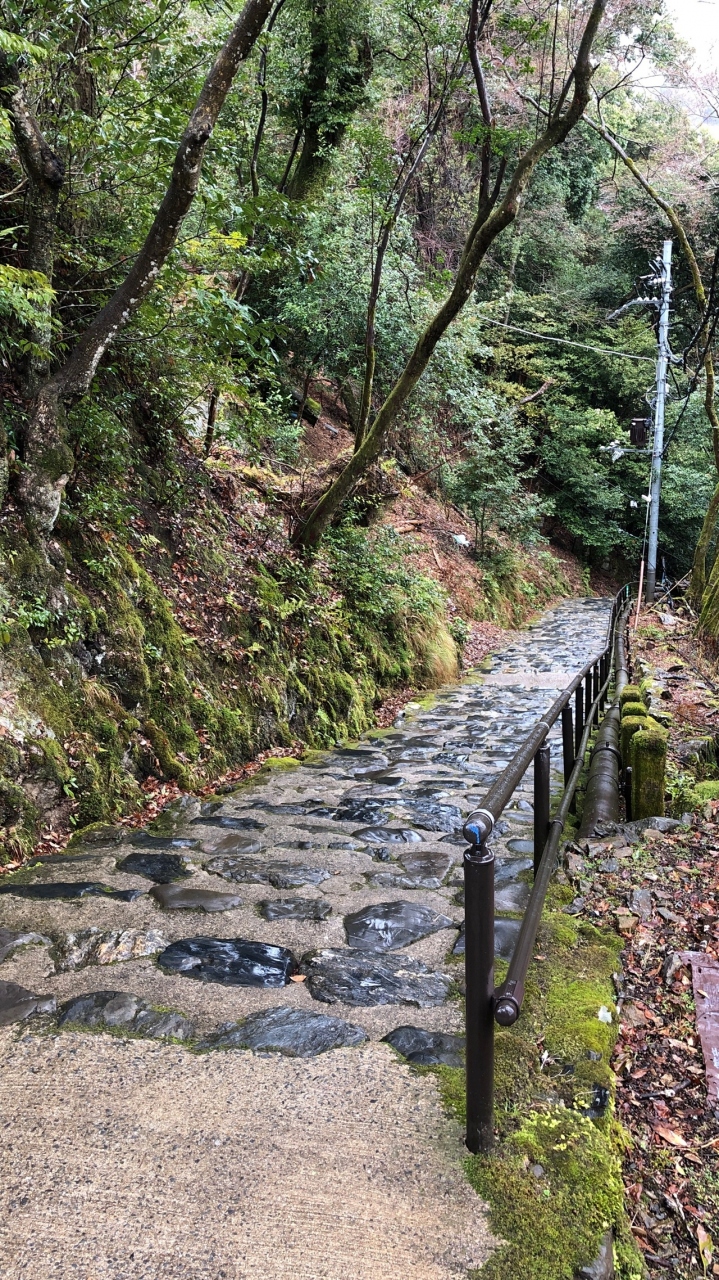高山寺・西明寺と並ぶ、三尾のお寺の一つです。高雄バス停から、徒歩15分ぐらいです。バス停から清滝川まで坂道を降り、高雄橋を渡ると緩い石段を上がり、境内ではさらに急な石段を上がります。山の中のお寺なので、アップダウンが激しかったです。