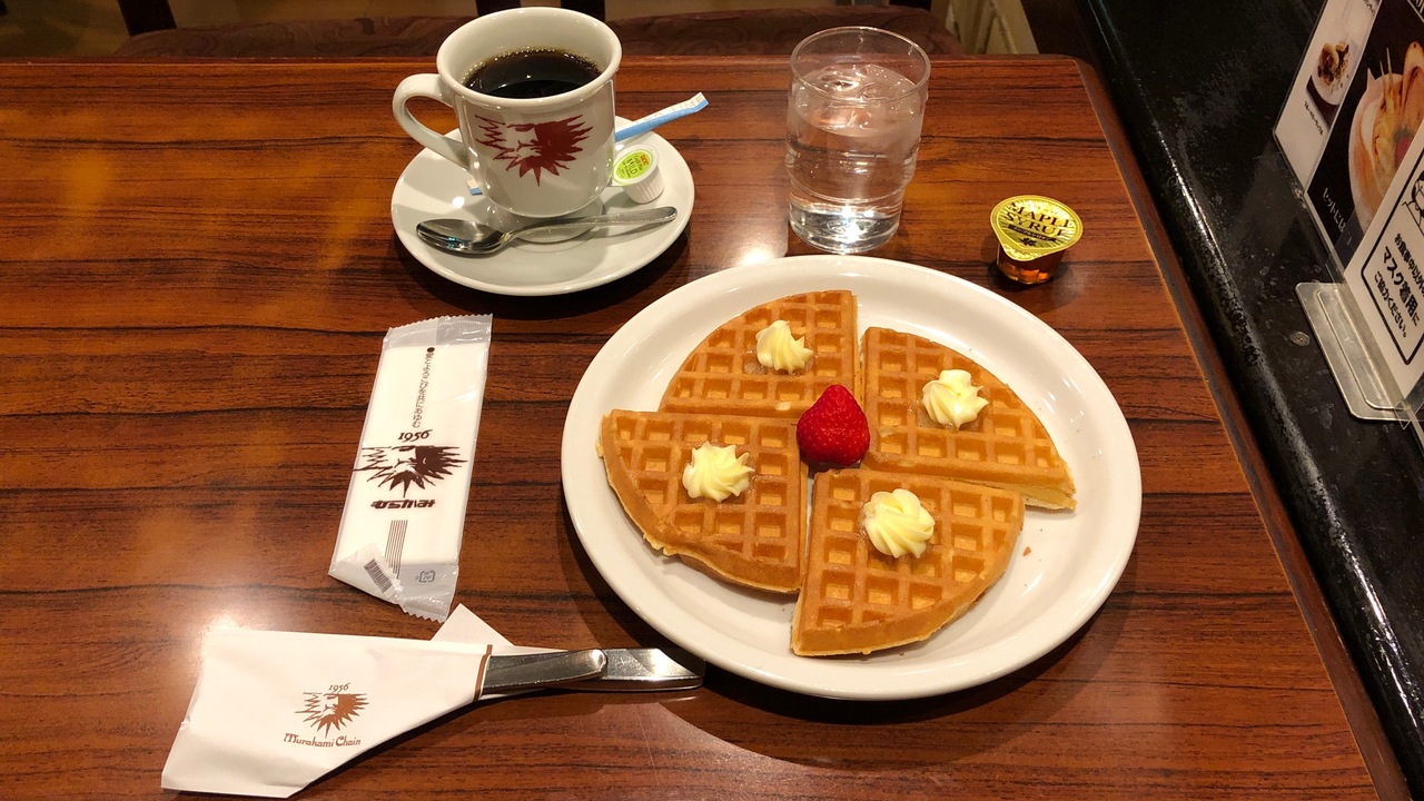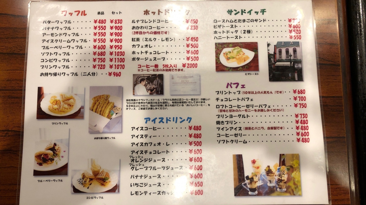 福山駅南口の飲み屋街にある老舗喫茶店です。外観はヨーロッパ調です。店内は、振り子時計やランプもある、レトロな雰囲気です。フードメニューも充実しており、自家製スパゲティが人気のようです。今回は、ワッフルセット830円を食べました。ブレンドコーヒーは、さすが専門店の味で満足しました。