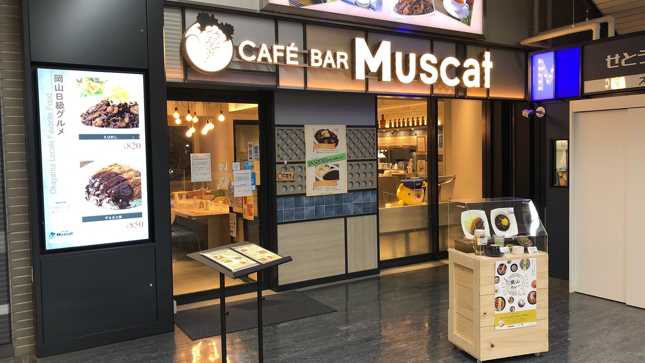 岡山駅・新幹線改札内のカフェ・バーです。食事メニューもあります。デミカツ丼、えびめし、千屋牛(ちやぎゅう)の焼肉丼、マスカットスカッシュなど、岡山のご当地グルメのメニューが充実しています。ちなみに千屋牛は、新見市生まれの、岡山以外ではあまり出会うことのできない貴重な牛です。