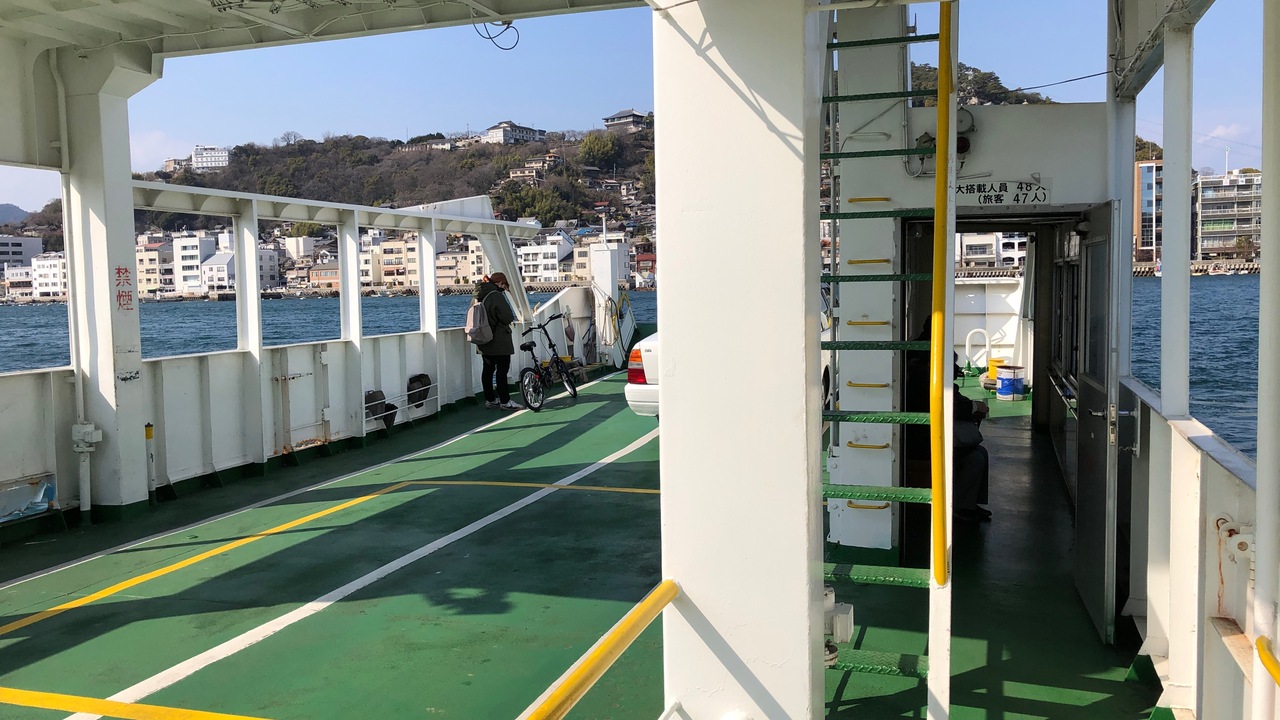 尾道市街地・土堂~向島・兼吉を結びます。所要4分、大人100円です。料金は、乗船後船内で払います。すぐ対岸へ着くので、お釣りがいらないように準備した方がいいです。座ることのできるイスはほとんどなく、船の両側に立ちました。船には壁もほとんど無いので、強風時は持ち物がとばないように注意が必要です。
