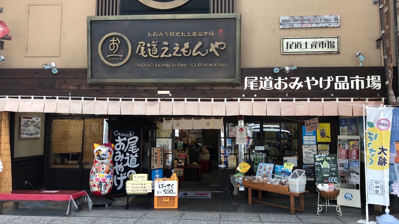 尾道中央通り商店街にあります。「ええもんや」は、長江口交差点と新幹線新尾道駅にもありますが、こちら中央通りの店が一番大きいです。土産物のほとんどが揃っているといえます。食事処を併設していますが、主に団体客向けで、事前予約が必要です。