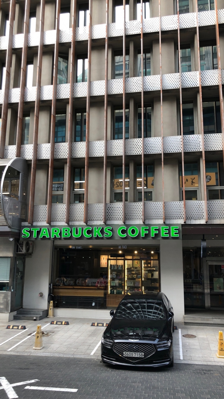 明洞の小道沿いにあるビル1階にあります。地下鉄・乙支路入口駅の6番階段すぐの場所にもスタバがありますが、その先の小道を左に入った場所です。アイスアメリカーノが4500wです。メニューも、ほとんど日本と同じでした。