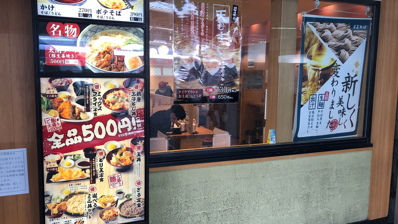 阪急十三駅のホームにあるそば屋です。他の若菜そばは、立ち食いのような形態もありますが、こちら十三店は、和食レストランのような広めの店内です。ミックスフライ定食やミニ丼・麺セットが税込550円と、お手頃価格です。