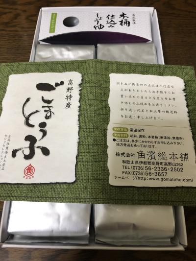 高野山で有名ならごまとうふ店は、こちら角濱と、濱田屋です。角濱には、レストランが併設されており、ごまとうふ尽くしのランチなどが食べられます。角濱のごまとうふは、常温で日持ちするのでお土産に最適です。直営店の他、山内の土産店でも売っていました。