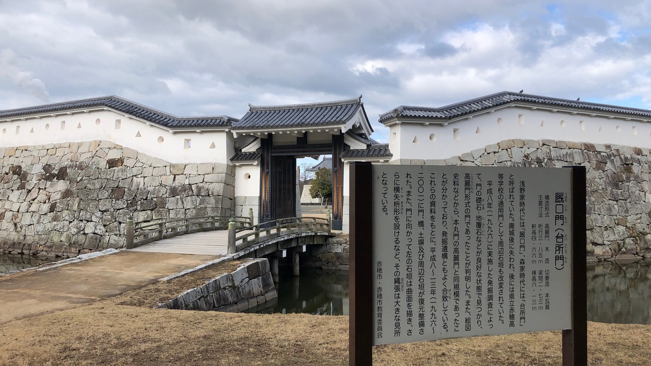 播州赤穂駅から南へ、徒歩10~20分ぐらいの場所です。江戸時代、赤穂藩の城として使われていました。現在は、広い公園となっています。復元された門、博物館、大石神社、体育館など、いろいろな施設が集まっています。