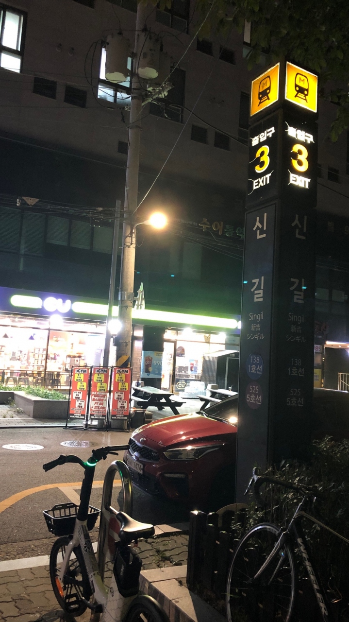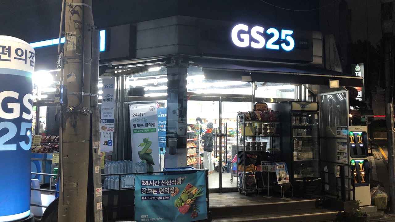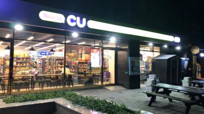 韓国でよく見かけるコンビニチェーン店です。街中で、一番多く見かけます。写真は、ソウル・新吉にあるCUです。イートインスペースが、店内外ともに広いです。韓国のコンビニ前では、飲食している人が多いのが印象的です。