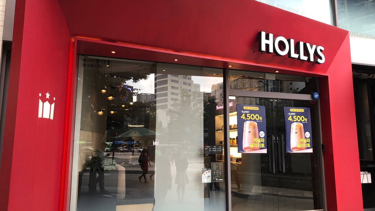 韓国でよく見かけるカフェです。赤い看板で、王冠のマークが目印です。金浦空港のほか、街中でも見かけます。アイスアメリカーノが、4000ウォンぐらいです。日本より高い印象ですが、サイズが大きいです。日本の関西にもホリーズカフェがありますが、別系列です。