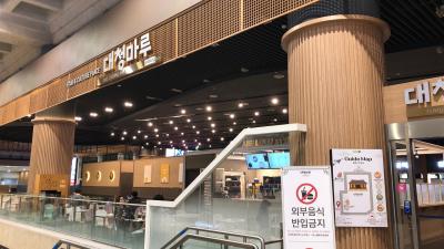 金浦空港国際線ターミナルに、フードコートがあります。出国審査場の一つ上の階です。チゲ屋さん、麺料理店、粉食店など、いくつかの店舗が入っています。早朝6時台に行くと、カフェしか開いていませんでした。その他の階には、パリバケットなどもあります。