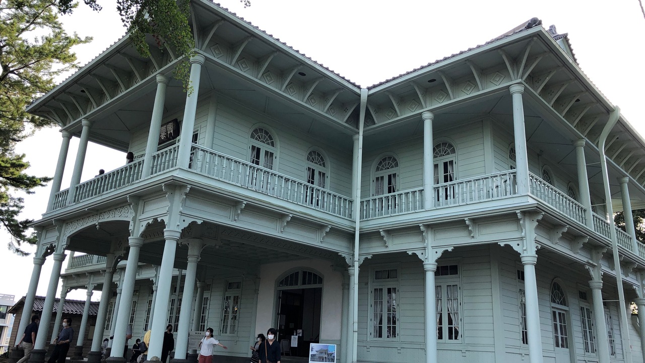松江城の南にある、洋風の建物です。薄いスカイブルーの壁が美しいです。もとは、松江市工芸品陳列所として建てられ、平成23年までは松江郷土館でした。今は、内部が無料で公開されています。1Fには、亀田山喫茶室というおしゃれなカフェもあります。