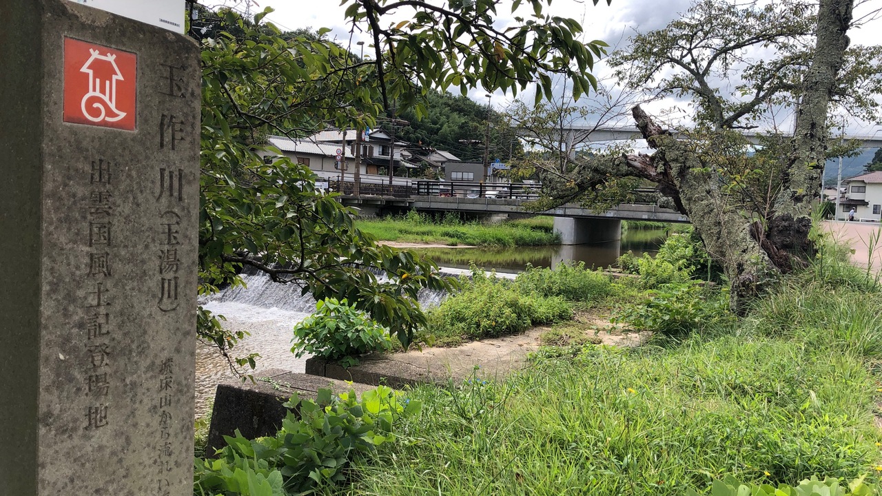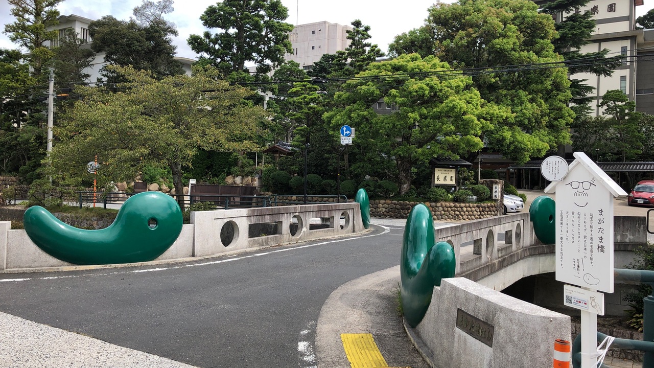 玉造温泉を流れる玉湯川に架かる橋です。橋の両側に、大きな勾玉が4つあり、フォトスポットになっています。この勾玉は、玉造温泉で一番大きな勾玉たちです。玉湯川には、いくつもの橋が架かり、川の両側が遊歩道・車道になっているので、散策におすすめです。