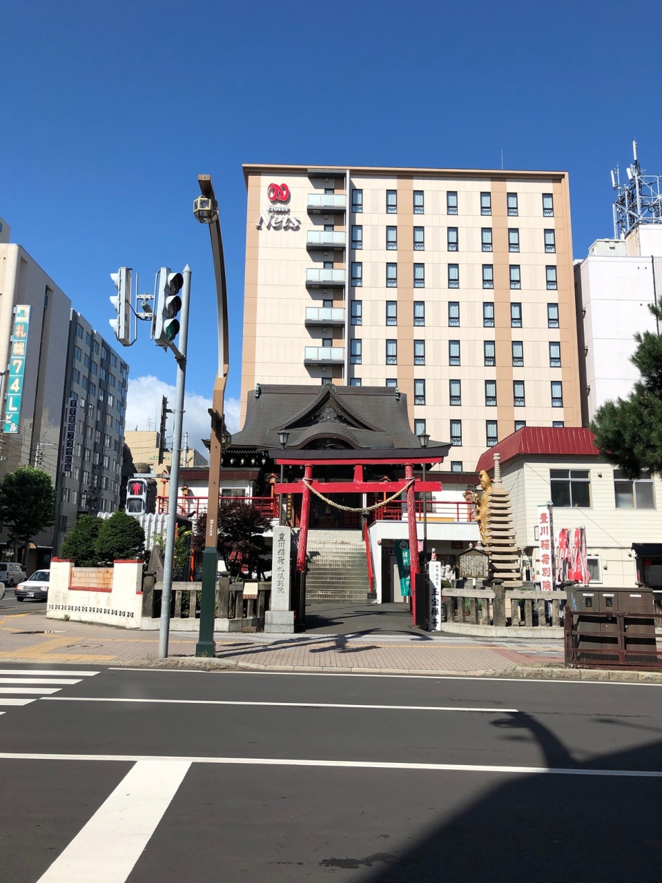 すすきのの南側にある稲荷です。「南7西4」の交差点に面しています敷地は狭いですが、小さな狐や、すすきの七福神などがいます。札幌駅通を挟んだ向かい側には、成田山新栄寺があり、その先には、中央寺・新善光寺と寺が続く、街中とは思えない雰囲気のエリアです。
