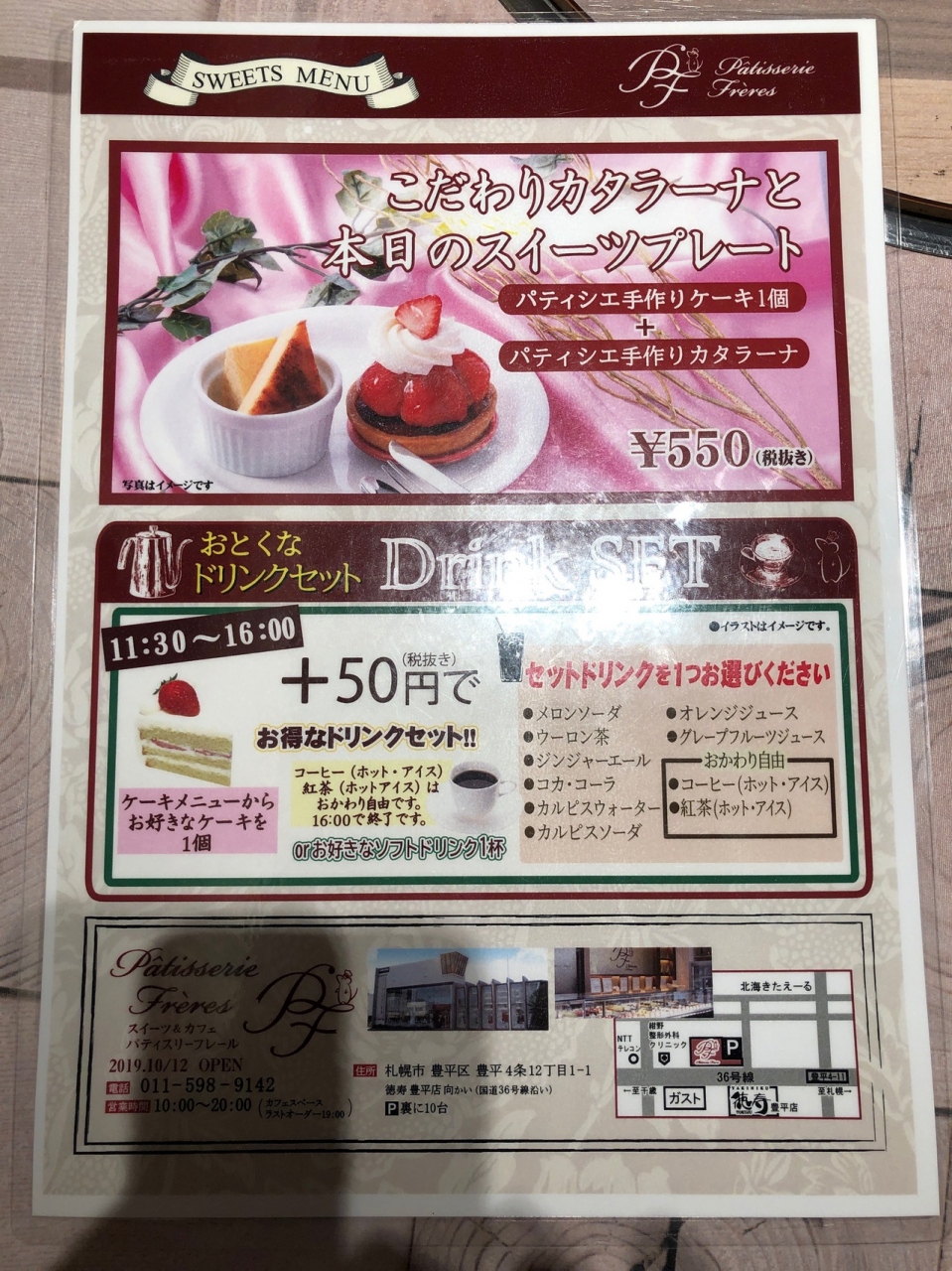 豊平区・国道36号沿いの洋菓子店です。カフェが併設されており、ショーケースのケーキとドリンクのセットで、税抜き760円です。バターケーキ(通常400円)とアイスコーヒー(通常500円)を頼みました。カフェ限定メニューとして、賞味期限2分間のショートケーキ、賞味期限5分のモンブランというのもあり、どちらも800円と高めですが、気になりました。
