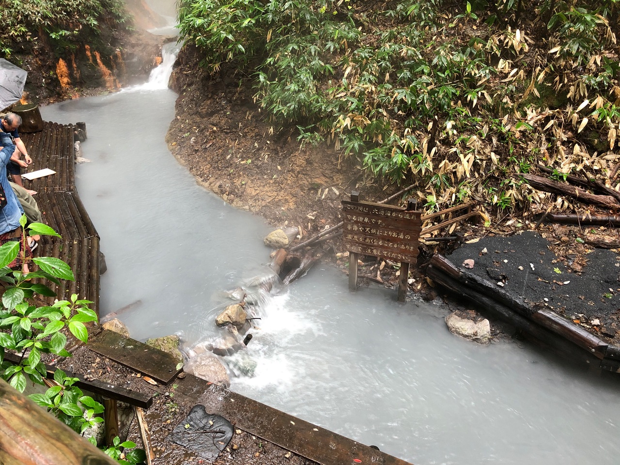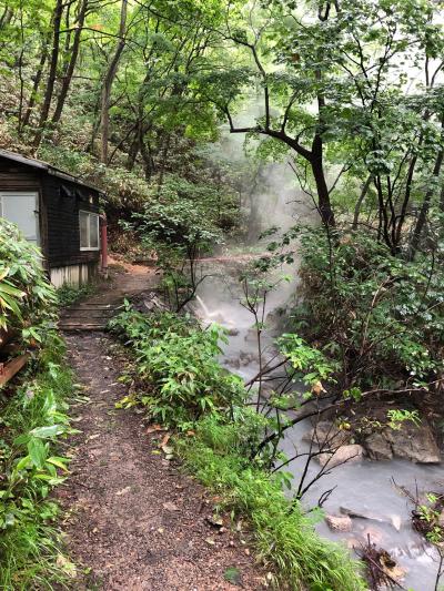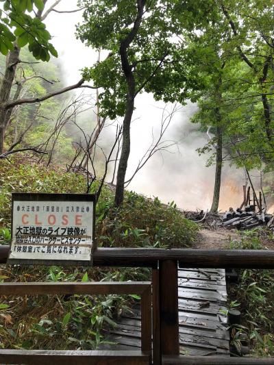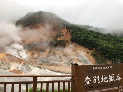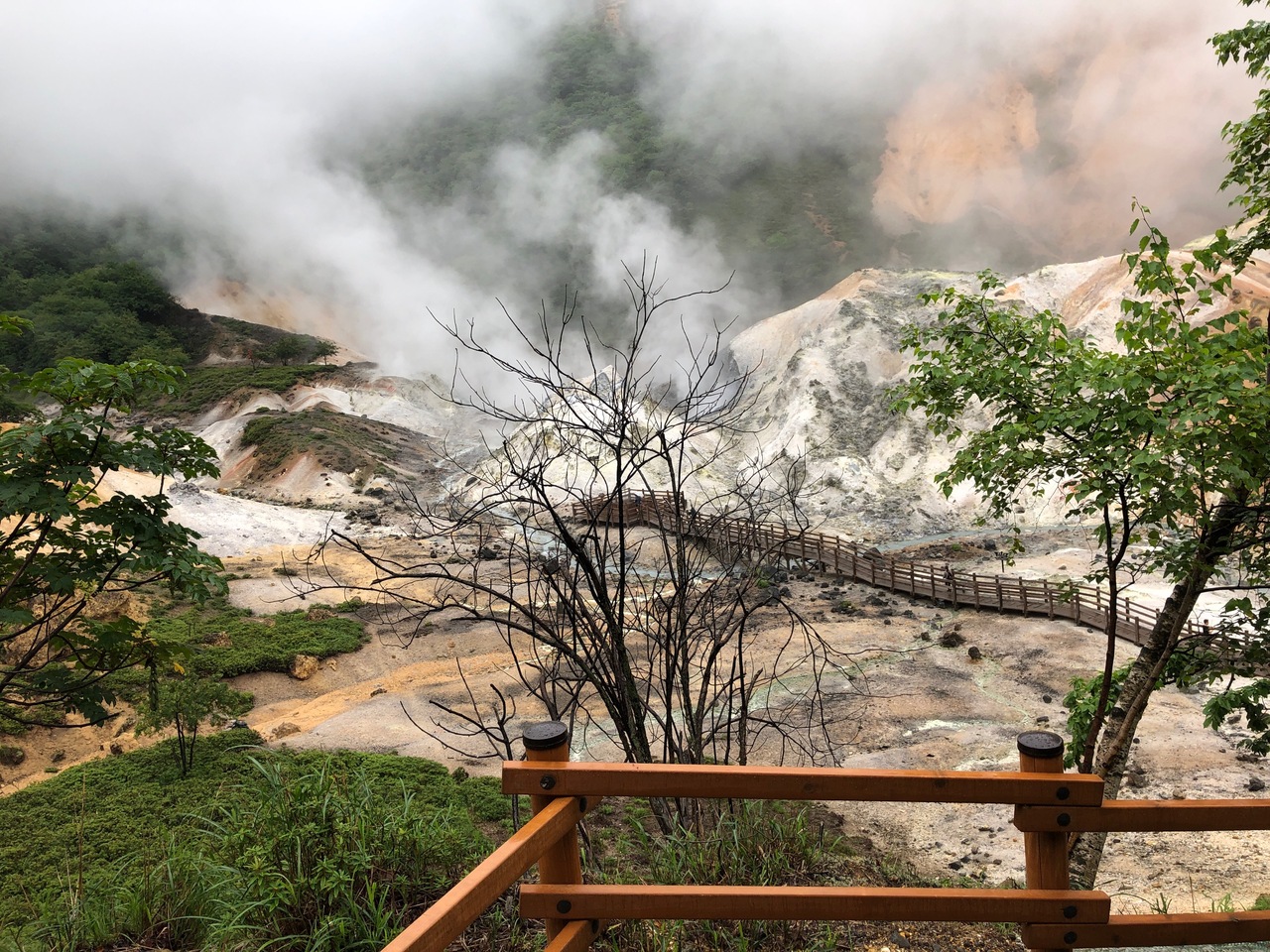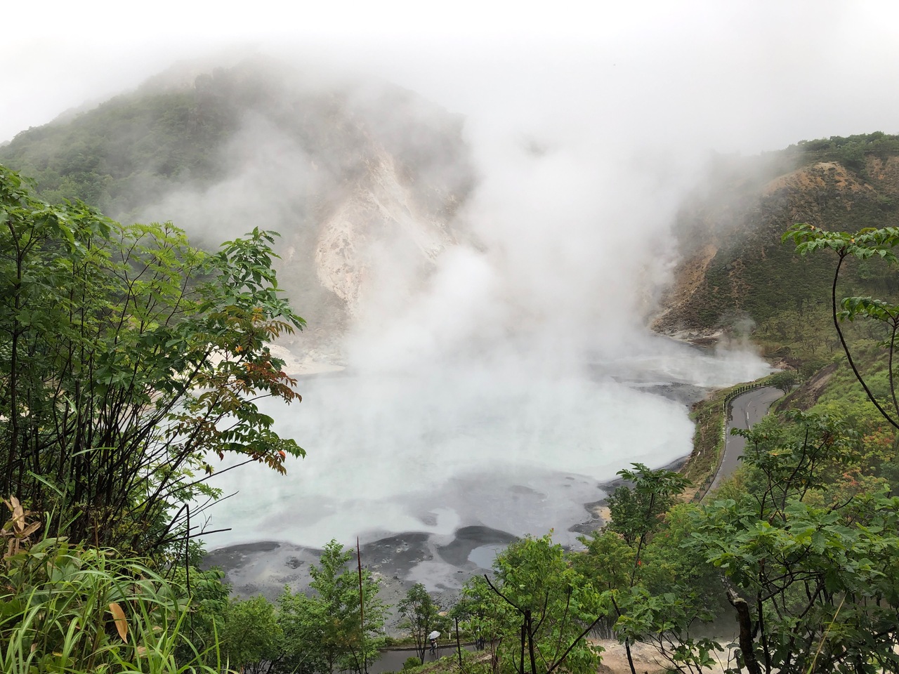 登別温泉の探索路です。地獄谷や大湯沼を巡るコースがいくつかあります。大湯沼コースは、道南バスの終点・足湯入口で降りて、その先の坂道を5分ほど歩いたところからスタートです。距離は1kmもありませんが、砂利道や急な階段も多く、健脚者向けです。