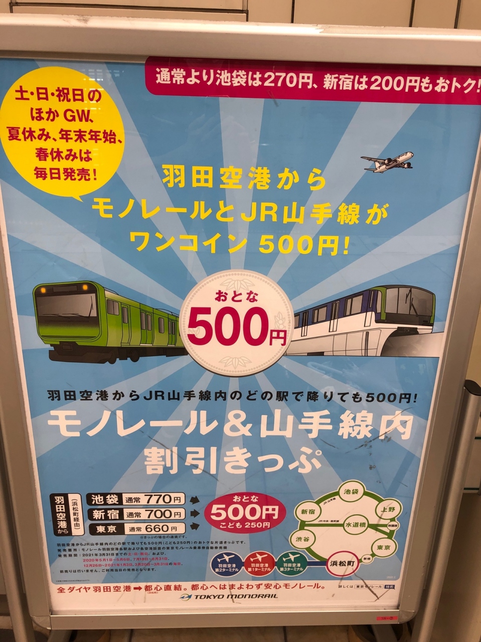 空港線とは、蒲田~羽田空港の線名ですが、品川や横浜から直通しています。2019年10月から値下げされ、例えば、品川~空港410円が290円になりました。羽田空港から乗る場合、品川方面行きと横浜方面行きが交互に発車しているので、乗り間違いに注意です。