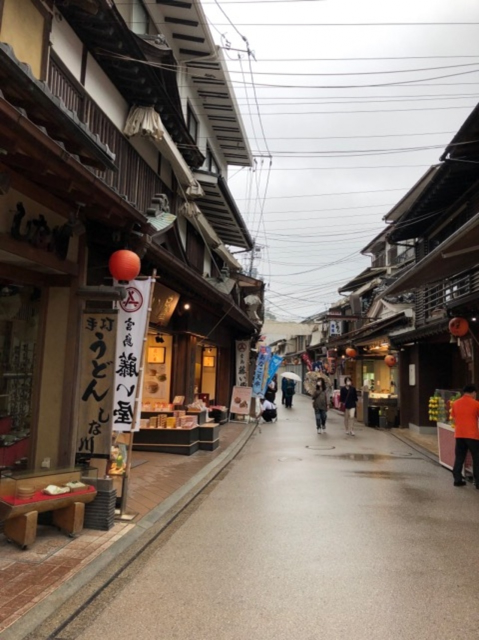 もみじまんじゅうの「やまだや」から厳島神社まで続く商店街です。宮島で一番賑わっています。かき料理店やあなご料理店、カフェ、土産物屋など、たくさんの店があります。スタバや宮島珈琲など、注目されているカフェが多いです。