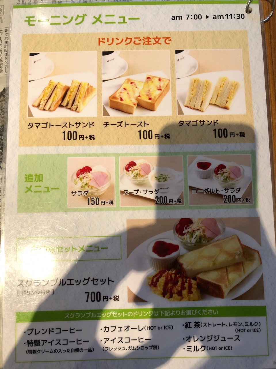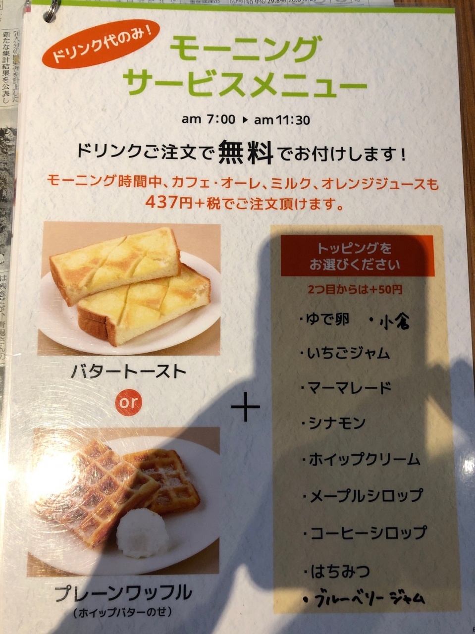 江坂公園南側にある、大阪のカフェチェーン店です。11時30分までのモーニングは、ドリンク代金だけで、トーストorワッフルが無料です。ホイップクリームなどのトッピングも1つ無料です。さらに、モーニング時間帯は、カフェオレなどがコーヒーと同じ437円で注文できます。新聞や雑誌も多く、ゆっくりできました。