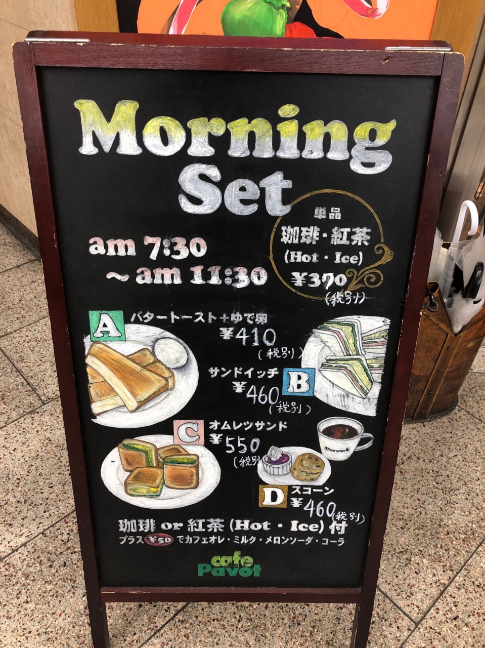 地下街ホワイティうめだから阪急百貨店方面へのエスカレーター・階段の途中にあるカフェです。阪急グランドビルB1Fにあたるそうです。7時30分から開いていて、モーニングメニューがあるので便利です。昔からスコーンが名物の店なので、モーニングでもスコーンがいただけます。