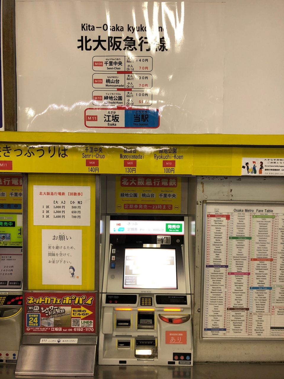 千里中央~江坂の電車です。電車は、江坂の先、梅田やなんばまで直通するので、ほとんど御堂筋線という感覚です。ただし、御堂筋線より運賃が安くて、初乗り運賃は100円です。えさから約8km先の千里中央も130円で行けます。