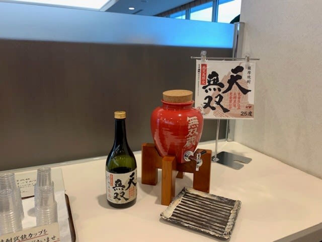 鹿児島空港2Fの、クレジットカードラウンジです。ソフトドリンク飲み放題、新聞・雑誌などが読めるのは、他の空港ラウンジと同じです。さらに、こちらラウンジ菜の花は、2種の焼酎の試飲もできます。おつまみのお菓子まであります。