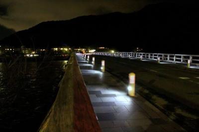 嵐山の有名な橋です。車道片側1車線なので渋滞しやすく、歩道も2人分ぐらいの幅しか無いので、混雑しやすいです。夜には、橋の明かりや、北側の山のライトアップにより、幻想的な雰囲気を味わえます。中ノ島を散策するのもおすすめです。
