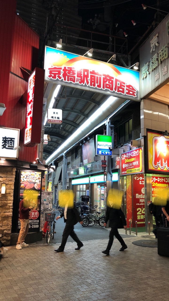 京橋駅前のアーケード商店街です。飲み屋が多く、夜が特に賑わっています。今回は、焼肉を食べに行きました。大阪の有名な焼肉屋、明月館と大同門が、2軒並んでいるので、どちらに入るか迷います。京都の有名な焼き鳥屋・鳥せいもありました。