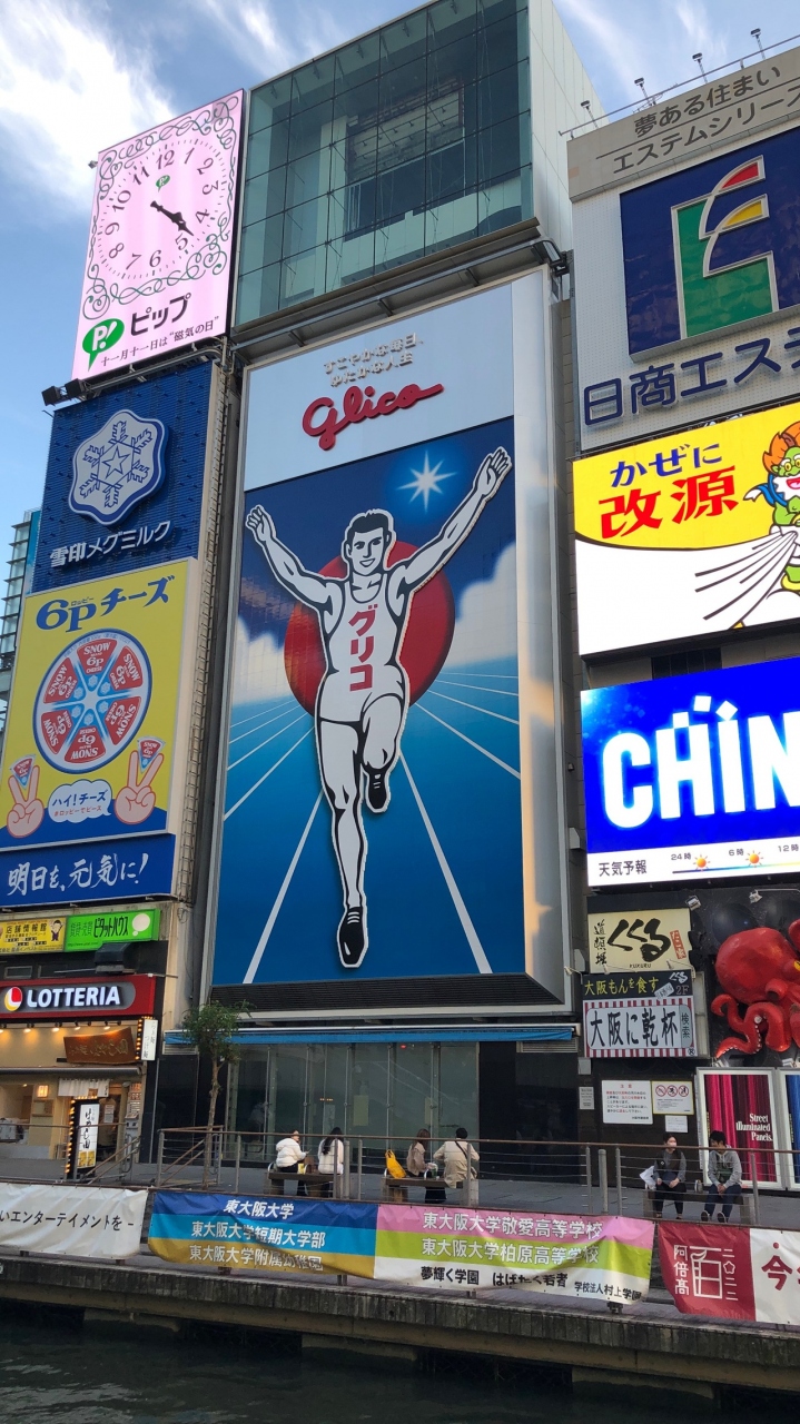 道頓堀川沿いにある、グリコの大きな看板です。ランナーの男性が手を挙げているポーズは、昭和の時代から変わりません。少しずつ、表情は変わってきているそうです。夜には、グリコの看板だけでなく、周辺の多くの看板がネオンのように照らされます。