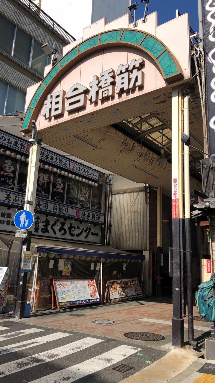 道頓堀川に架かる相合橋から、千日前通りまで、200メートルほどのアーケード商店街です。「あいあいばし」商店街と呼ばれますが、橋の名前である相合橋は、本来は「あいあうばし」と読むようです。正宗屋という居酒屋が人気です。