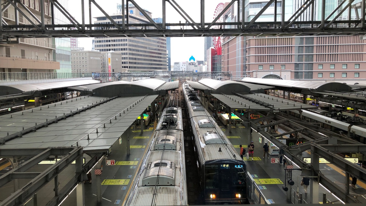 東京と神戸を結ぶ路線です。日本で初めて鉄道が開通した区間です。日本の大動脈ともいえます。関西エリアでは、京都線・神戸線と呼ばれ、新快速が、私鉄よりも速いスピードで、都市間を結んでいます。写真は、京都線と神戸線の境目、大阪駅です。
