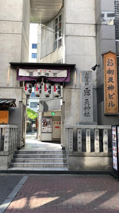 東梅田駅の南側にあります。周囲は高いビルが建ち並び、都会の中にある小さな神社です。正式名は 露天(つゆのてん)神社です。昔、神社の境内で、心中事件がありました。この事件をもとに、近松門左衛門が、人形浄瑠璃をつくりました。この浄瑠璃に出てくるヒロインが、お初という名前です。