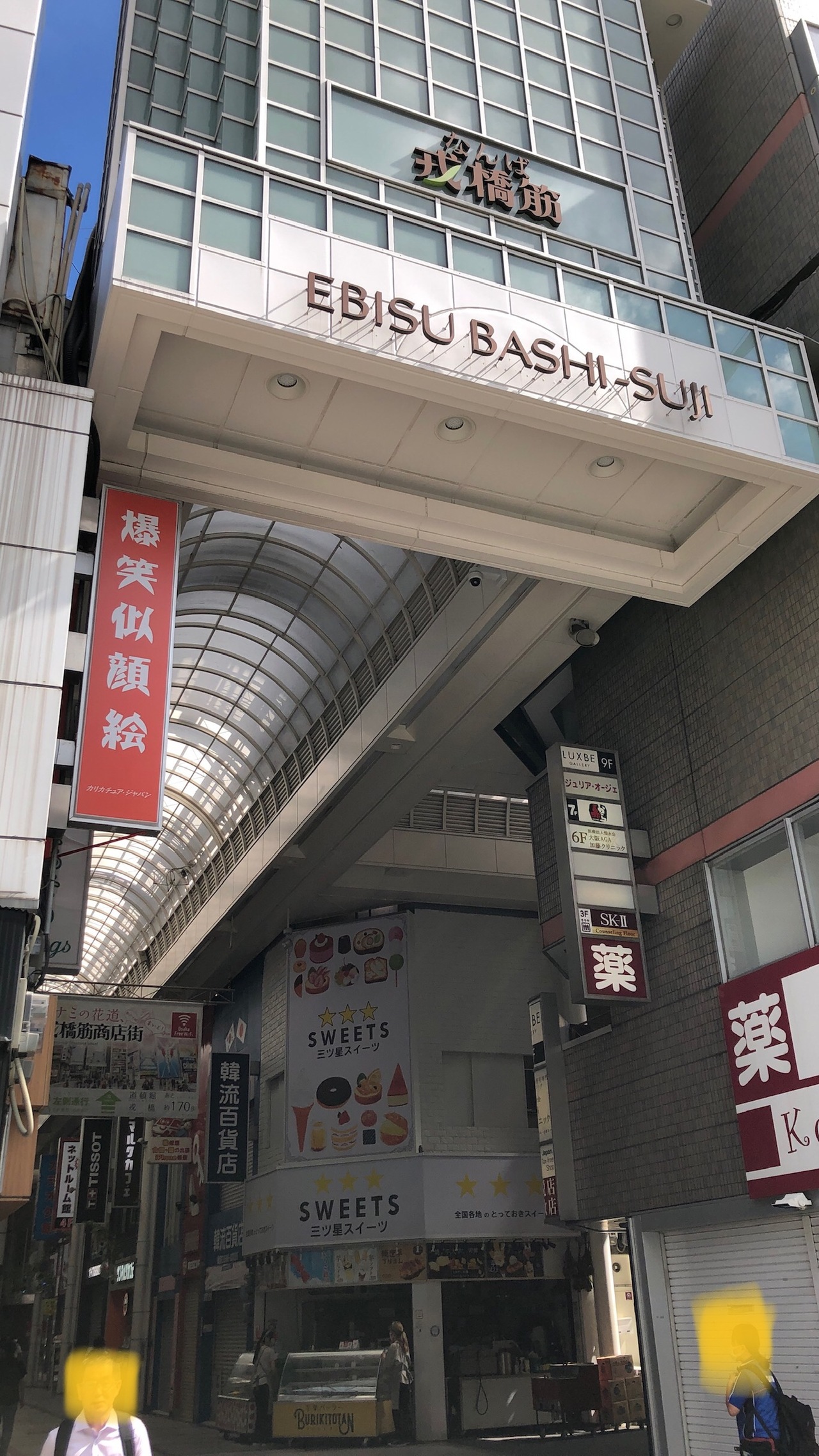 戎橋ら南へ、難波駅まで続くアーケード商店街です。道頓堀や難波エリアを結ぶので、観光客で混んでいることが多いです。豚まんの「蓬莱」、ふわふわチーズケーキの「りくろーおじさん」など、大阪ならではの店もあります。