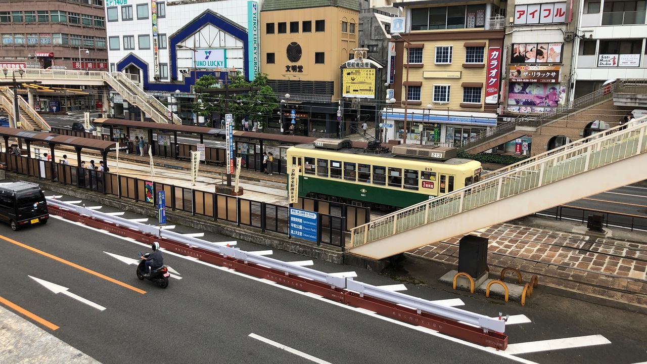 長崎市内を走る路面電車です。長崎市は、路面電車と路線バスがとても多く走っており、生活にも観光にも便利そうです。路面電車で行ける観光地は、JR長崎駅、中華街、出島、グラバー園、大浦天主堂、平和公園などがあります。