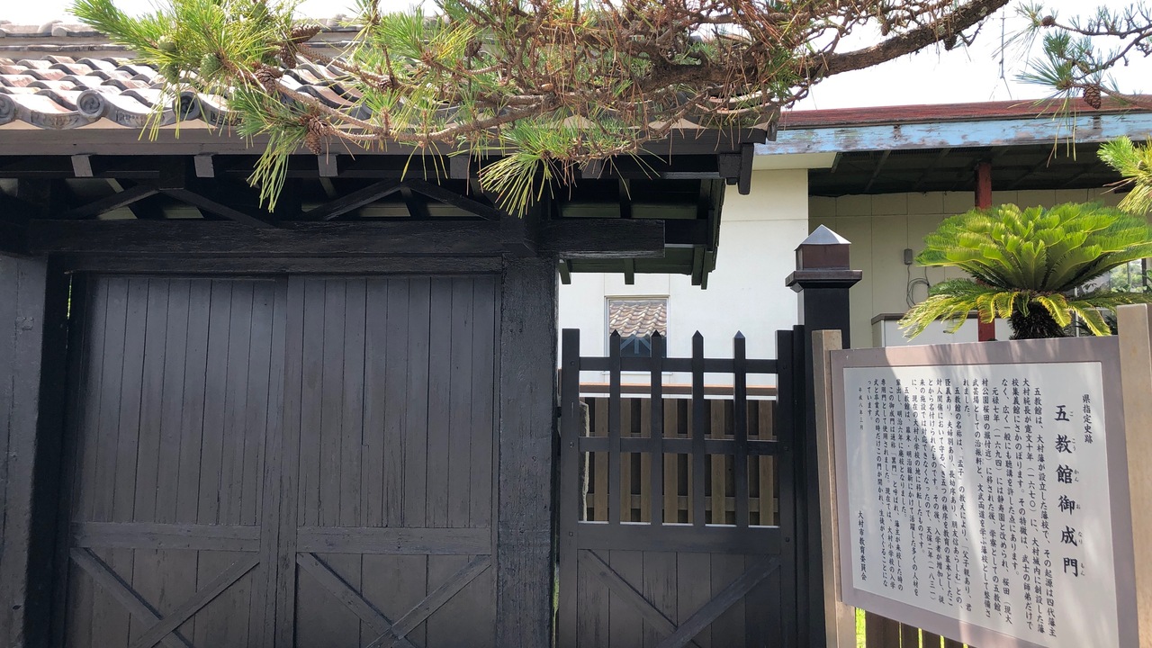 五教館は、大村藩の藩校です。五教とは、対人関係において守るべき5つの教えで、これにちなんで、五教館と名付けられました。現在の五教門は、大村小学校の敷地にあります。小学校の入学式と卒業式の時だけ門が開かれ、子どもたちが通るそうです。